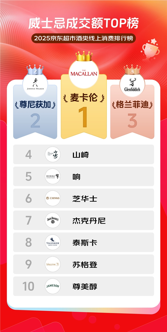 近日,京东超市正式发布2025年度威士忌成交额TOP榜,麦卡伦、尊尼获加、格兰菲迪、山崎、响、芝华士、杰克丹尼、泰斯卡、苏格登、尊美醇十大品牌上榜,彰显了威士忌品类在消费市场的持续热度与多元化格局。